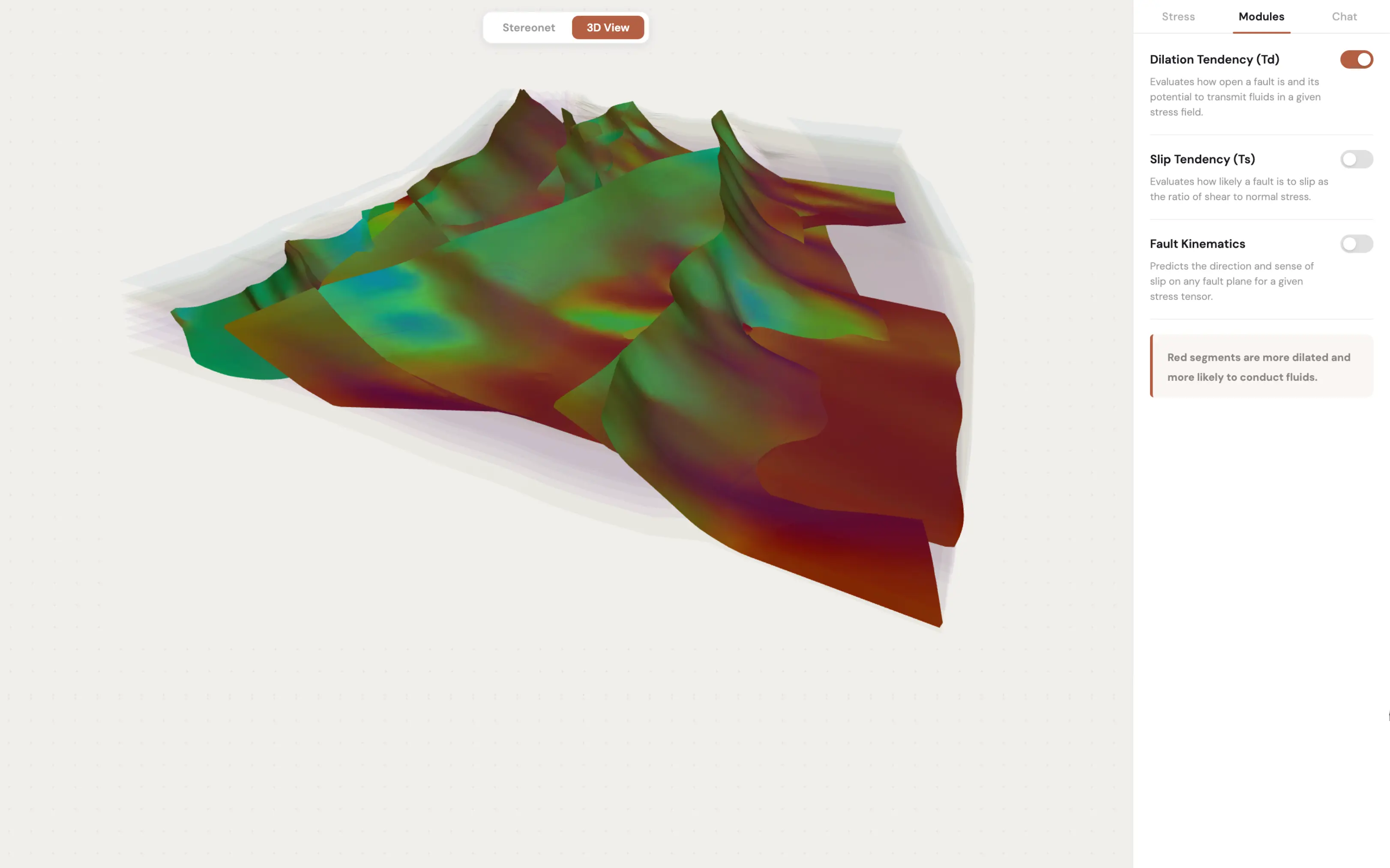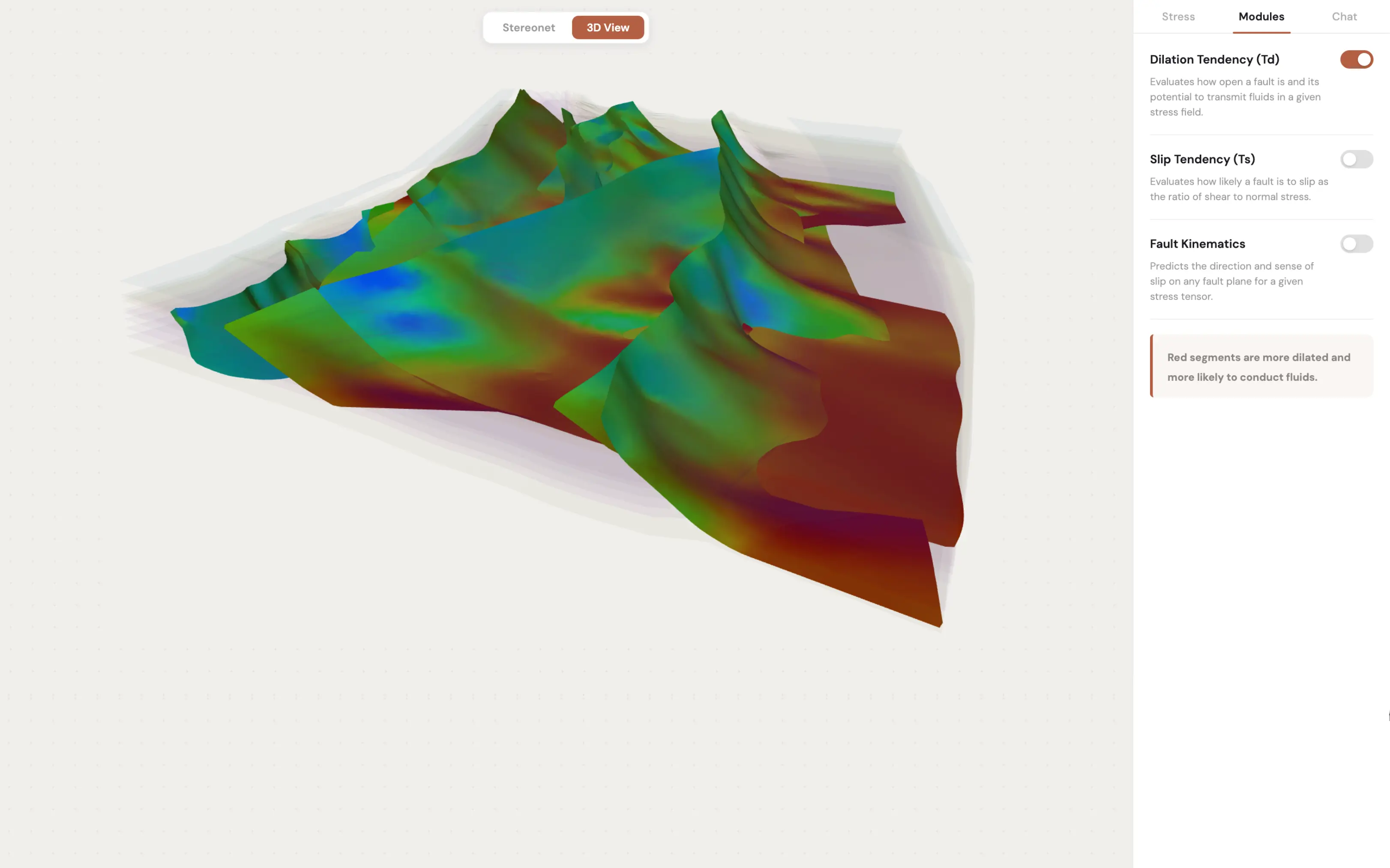 Compute dilation tendency and slip tendency for every fault segment in a given stress field. High dilation tendency identifies faults that are mechanically open and able to transmit fluids. High slip tendency flags faults at risk of reactivation. Apply the results to target permeable structures in geothermal reservoirs, ore systems and aquifers, or to assess seal integrity for CO₂ storage and hydrocarbon traps.